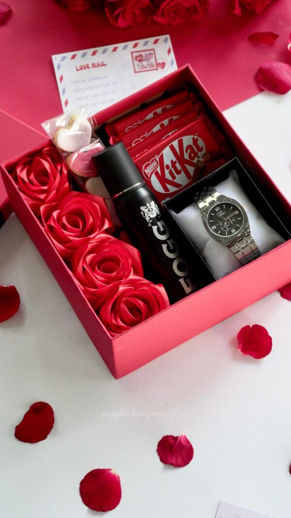 .In hard red box with artifical rose